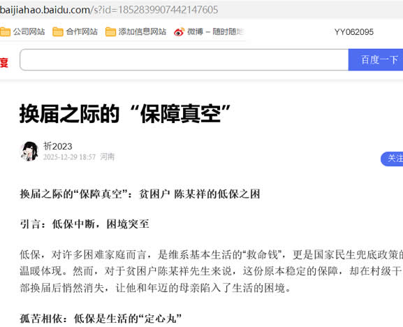 对于陈某祥这样的困难群众而言,低保金不仅是生活的“救命钱”,更是国家政策赋予的合法权益。希望相关部门能够关注到他的困境,介入调查此事,查明低保被无故取消的原因,督促村级组织规范履职,要么恢复其低保资格、补发停发的资金,要么给出合法合规的解释和处理方案。更重要的是,要以此为戒,加强对村级换届后社会救助工作的衔接与监管,避免类似的“保障真空”再次出现,让民生兜底政策真正温暖每一个需要帮助的人。